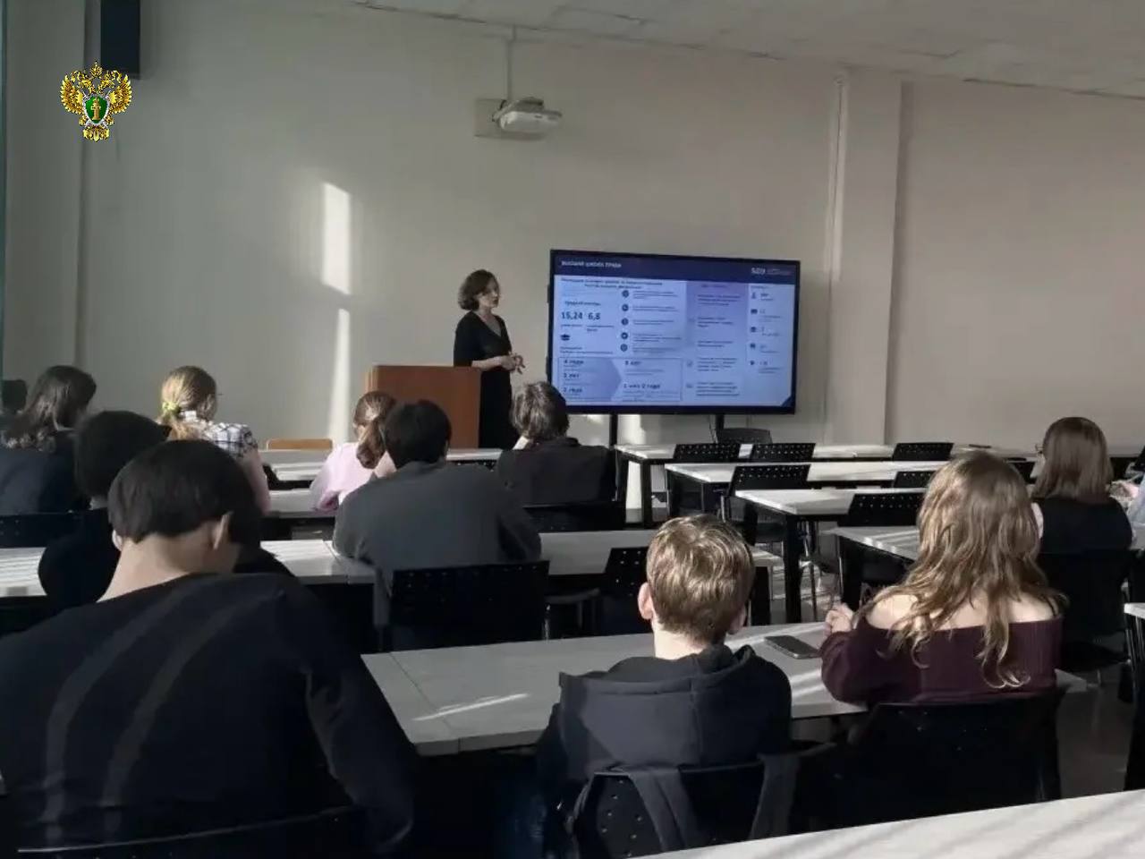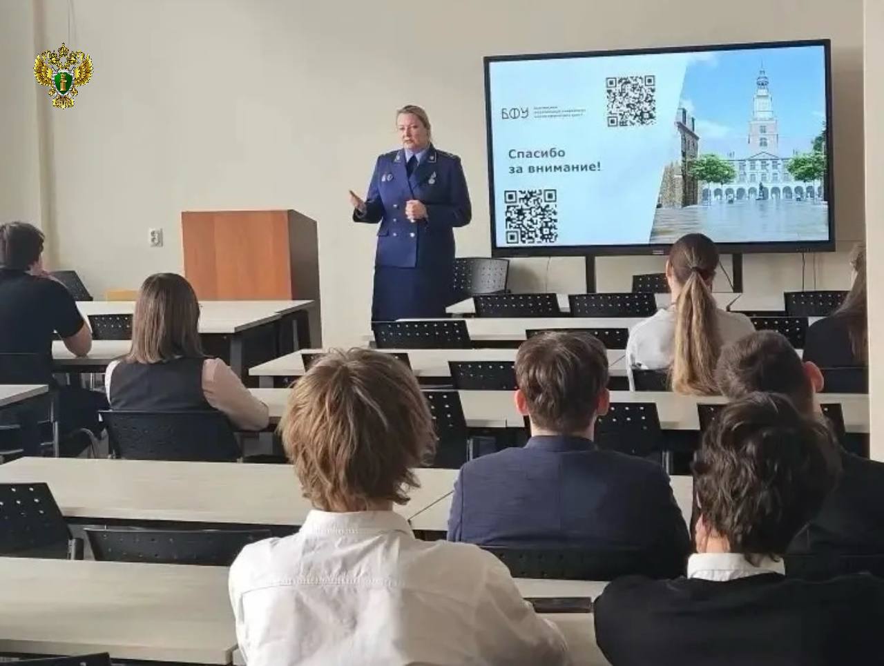 С приветственным словом выступила начальник отдела кадров прокуратуры Калининградской области Наталья Феклистова. Она рассказала учащимся о возможности целевого обучения, требованиях к будущим работникам надзорного ведомства, поделилась своей историей выбора профессии и воспоминаниями о студенчестве.