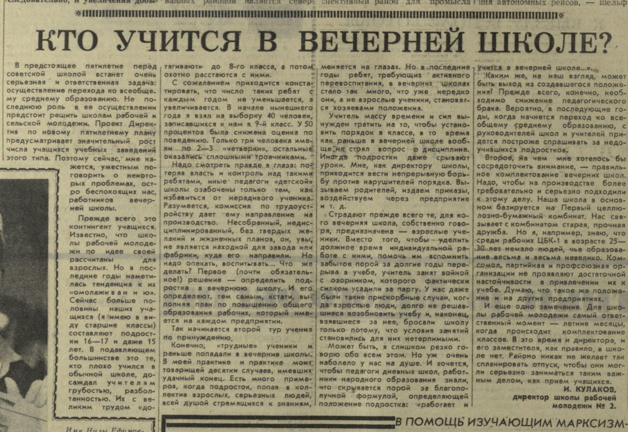 60 лет назад на страницах местной газеты И. Кулаков, директор школы рабочей молодёжи №2, рассказал о проблемах, с которыми сталкиваются «вечерние школы». Изначально такие школы предназначались для людей, которые хотели учиться, но в силу разных не смогли получить общего среднего образования, но вышло так, что в вечерних школах оказался очень большой процент бывших второгодников из обычных школ, зачастую с очень низкими оценками по поведению. Атмосфера, по словам педагога, в итоге не располагала к обучению. По мнению Кулакова нужно начинать строже спрашивать за таких детей с директоров обычных школ, и плотнее работать с комсомольскими организациями предприятий.