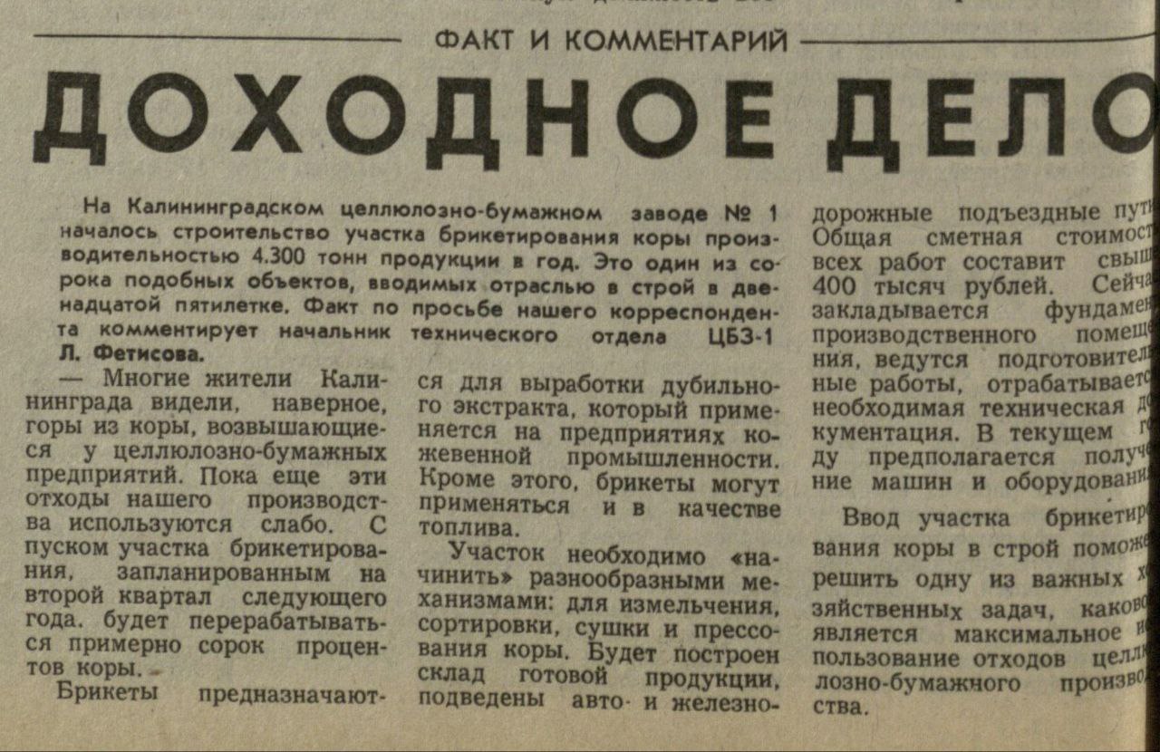 40 лет назад на ЦБЗ-1 сообщили о начале строительства участка брикетирования коры. Он позволил бы перерабатывать до 40% отходов предприятия , производить дубильный экстракт для кожевенной промышленности и топливные брикеты.