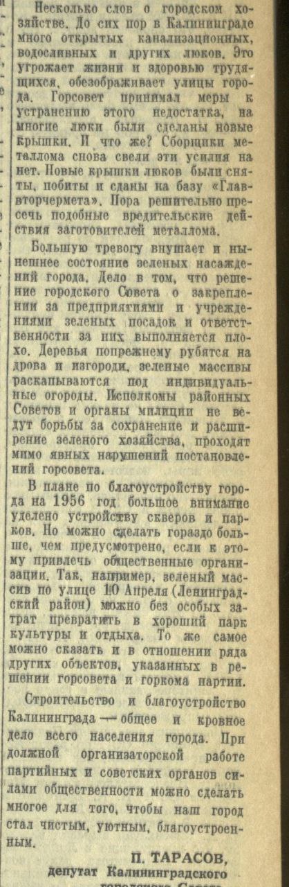 70 лет назад депутат горсовета П. Тарасов сетовал на то, что в Калининграде много открытых канализационных люков, злоумышленники их воровали на металлолом.