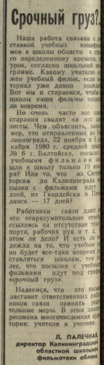 45 лет назад калининградцы возмущались работой почты. «Срочный груз» из Гвардейска в Правдинск шёл – 17 (!!!) дней. Речь шла об учебных фильмах, которые были нужны педагогам в соответствии с учебным графиком.