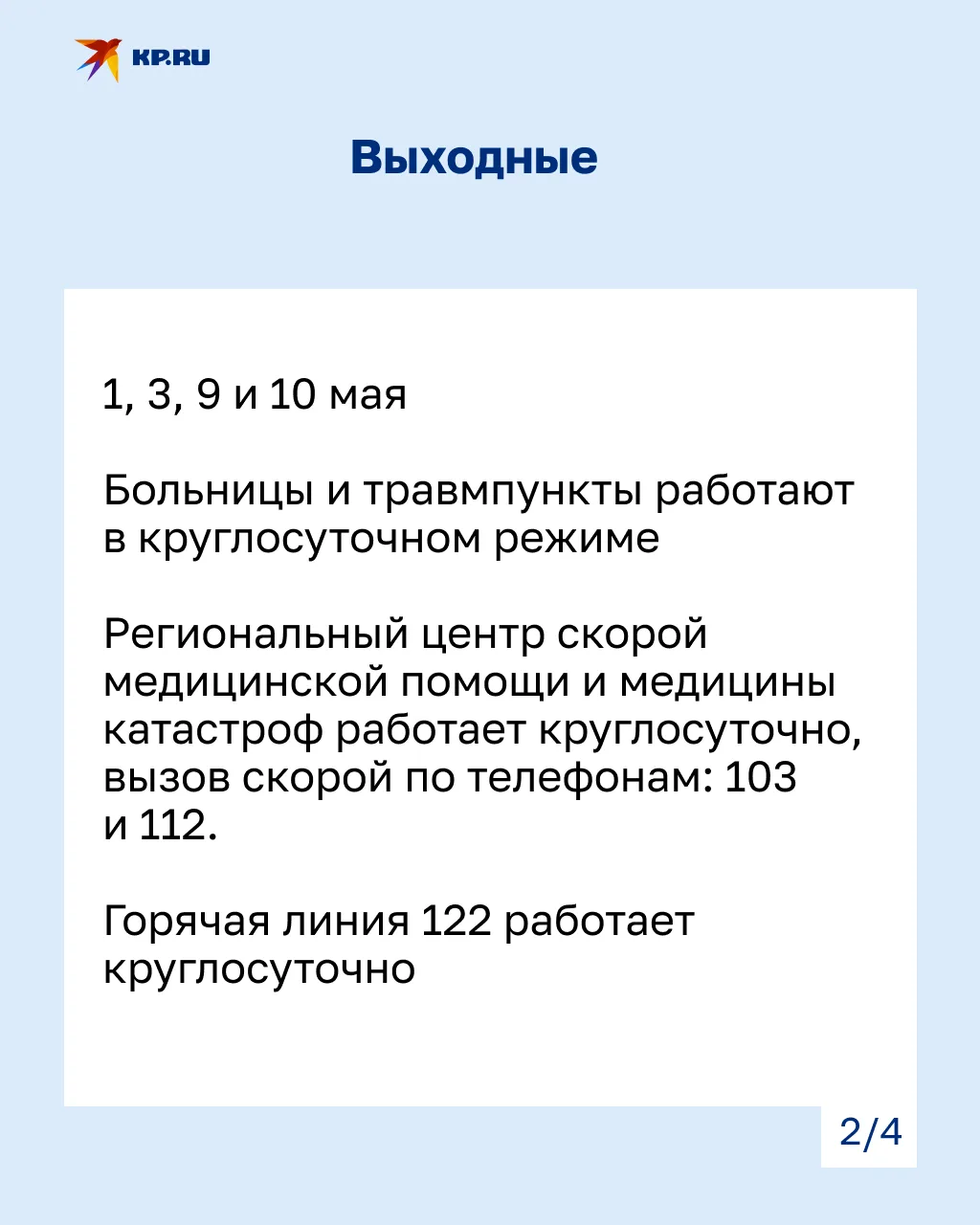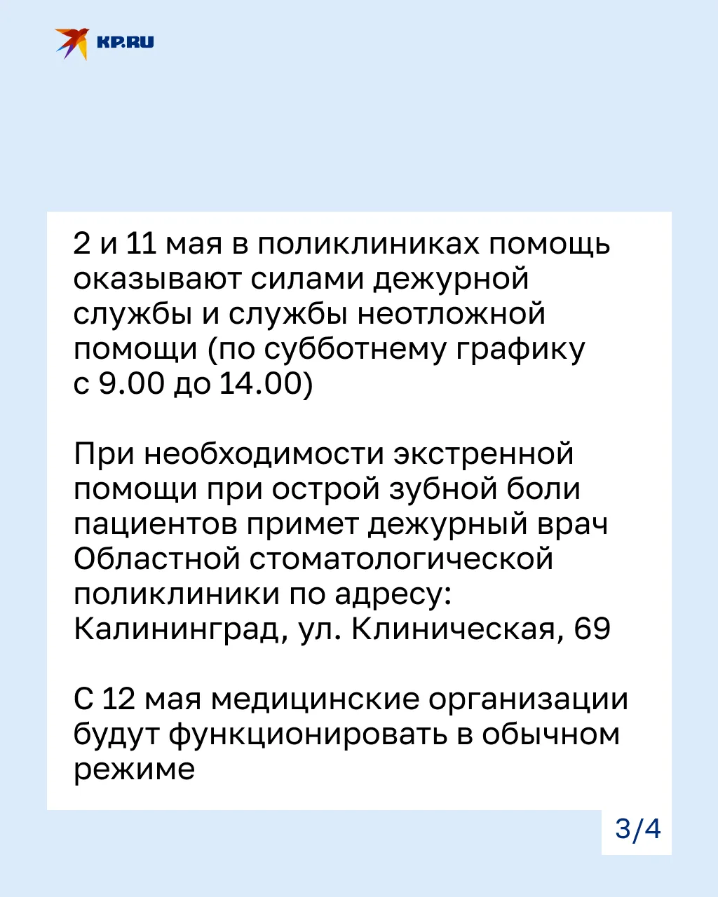 В министерстве здравоохранения Калининградской области сообщило о работе подведомственных учреждений в праздничные выходные дни с 1 по 3 мая и с 8 по 11 мая. Листайте наши карточки