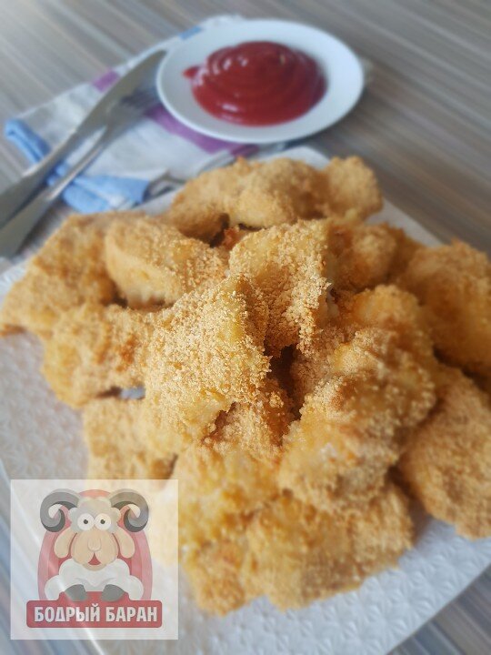 Выложите подготовленные наггетсы на противень, застеленный пергаментом, и отправьте в заранее разогретую до 200° духовку. Готовьте 20-30 минут — время может варьироваться в зависимости от мощности вашей духовки. Наггетсы должны покрыться аппетитной золотистой корочкой.