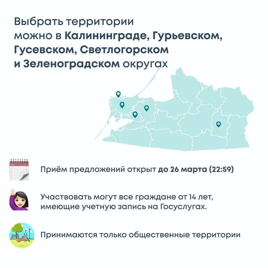 Принимаются территории в Калининграде, Гурьевском, Гусевском, Зеленоградском и Светлогорском округах. Проекты-победители реализуем в следующем году по нацпроекту «Инфраструктура для жизни».