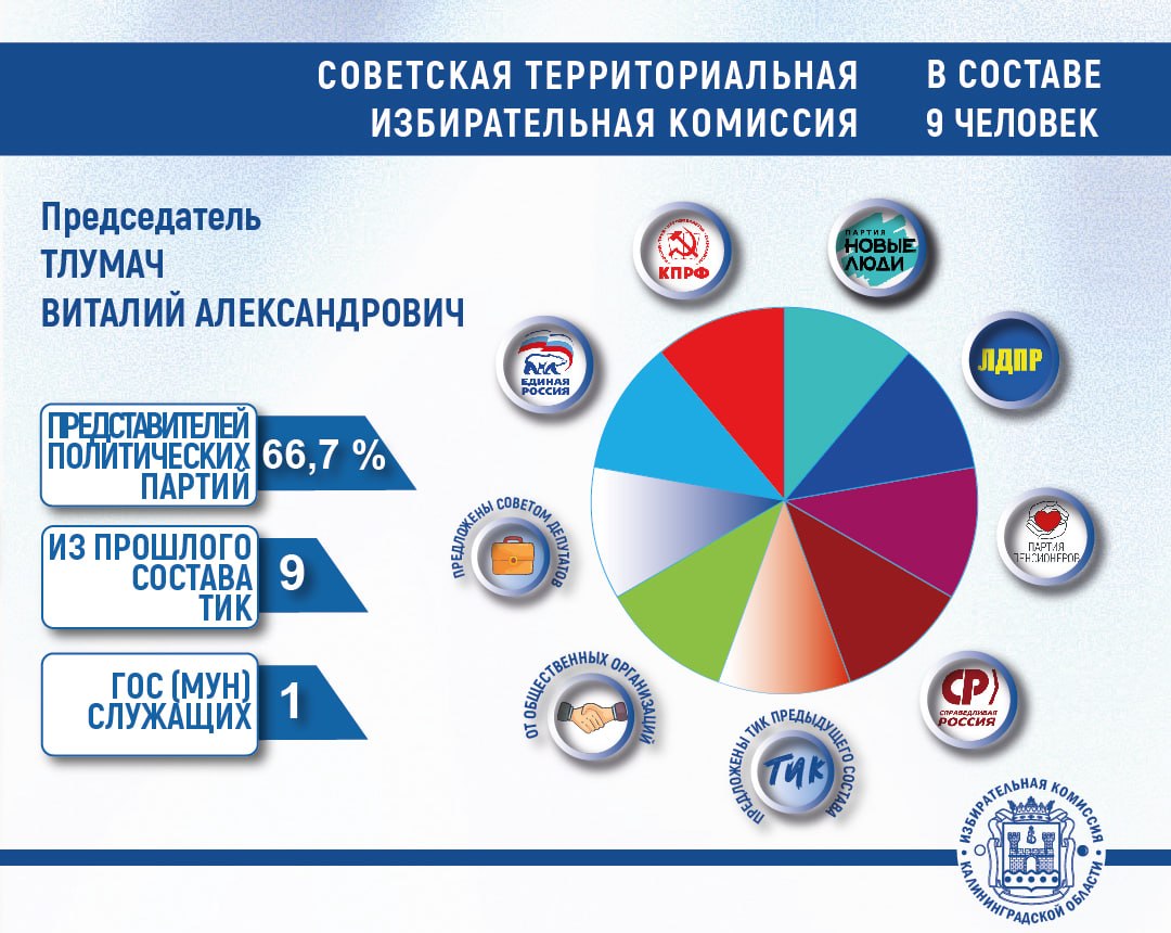 В составы территориальных комиссий назначено по 9 человек. В каждой комиссии присутствуют представители 6 политических партий. Кроме того, в каждую из ТИК назначены по 1 человеку, выдвинутому окружными Советами депутатов и предыдущими составами комиссий. В Советскую комиссию назначен 1 представитель общественной организации, в Краснознаменскую 1 выдвиженец собрания избирателей по месту работы.