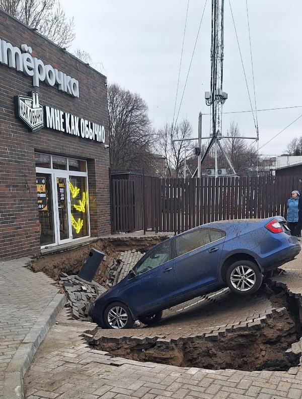 На улице Егорова, 10а, в Балтийске в воскресенье, 29 марта 2026 года, страшная картина представилась владельцу «Шкоды Рапид», припарковавшемуся у недавно открытого филиала «Пятёрочки». Его машины стала уходить под землю вместе с плиткой.
