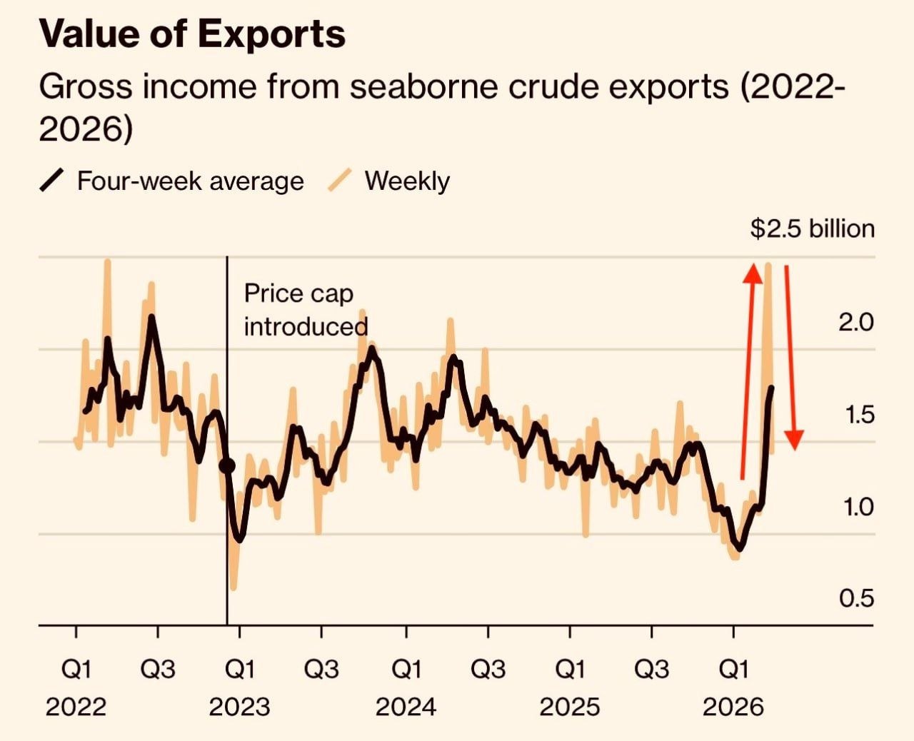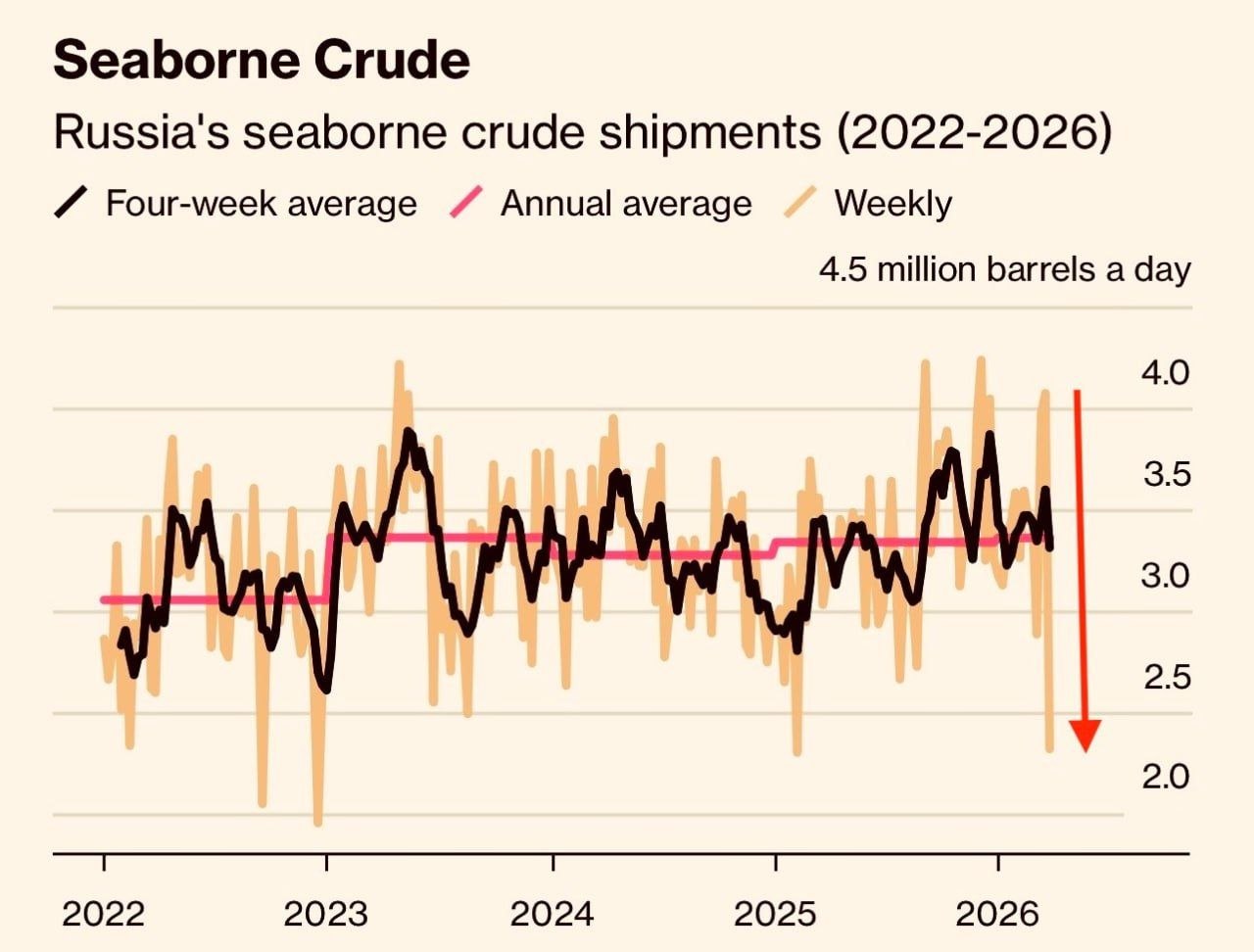 В первые три недели марта Россия отгружала в среднем 4 млн баррелей в сутки. В последнюю неделю из-за атак на балтийские порты объем отгрузок упал почти вдвое, до 2,3 млн баррелей в сутки. Средние показатели всего российского нефтяного экспорта и в деньгах, и в объемах нефти не добрали из-за последних атак примерно 40%.