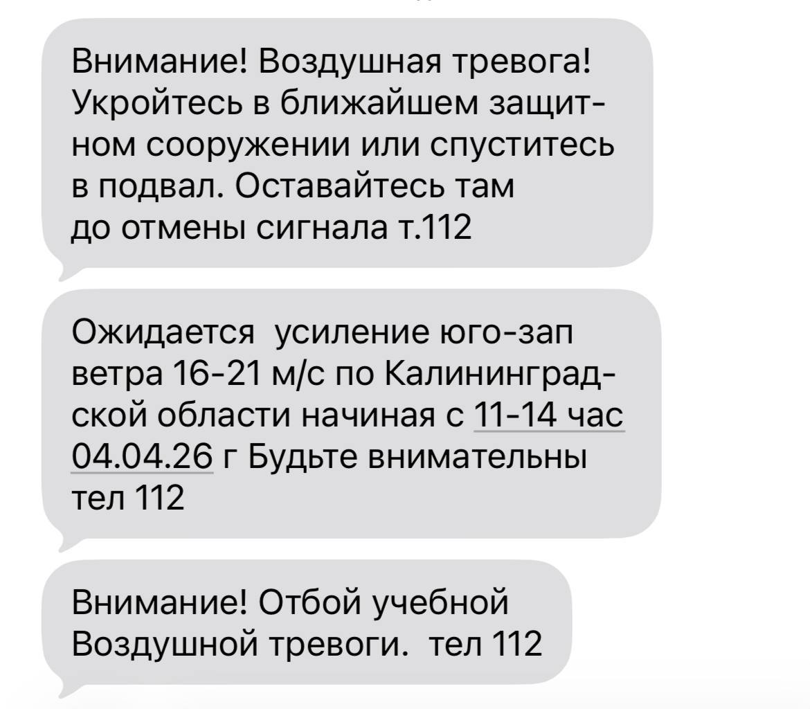 В пятницу, 3 апреля, местным жителям стали приходить смс от РСЧС. В тексте сообщалось о воздушной тревоге и рекомендации укрыться в защитных сооружениях до отмены сигнала. В правительстве Калининградской области заявили, что рассылка является ошибочной.