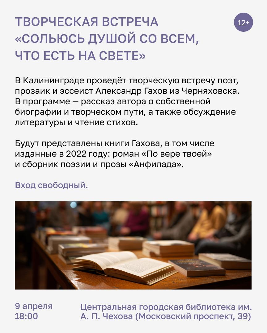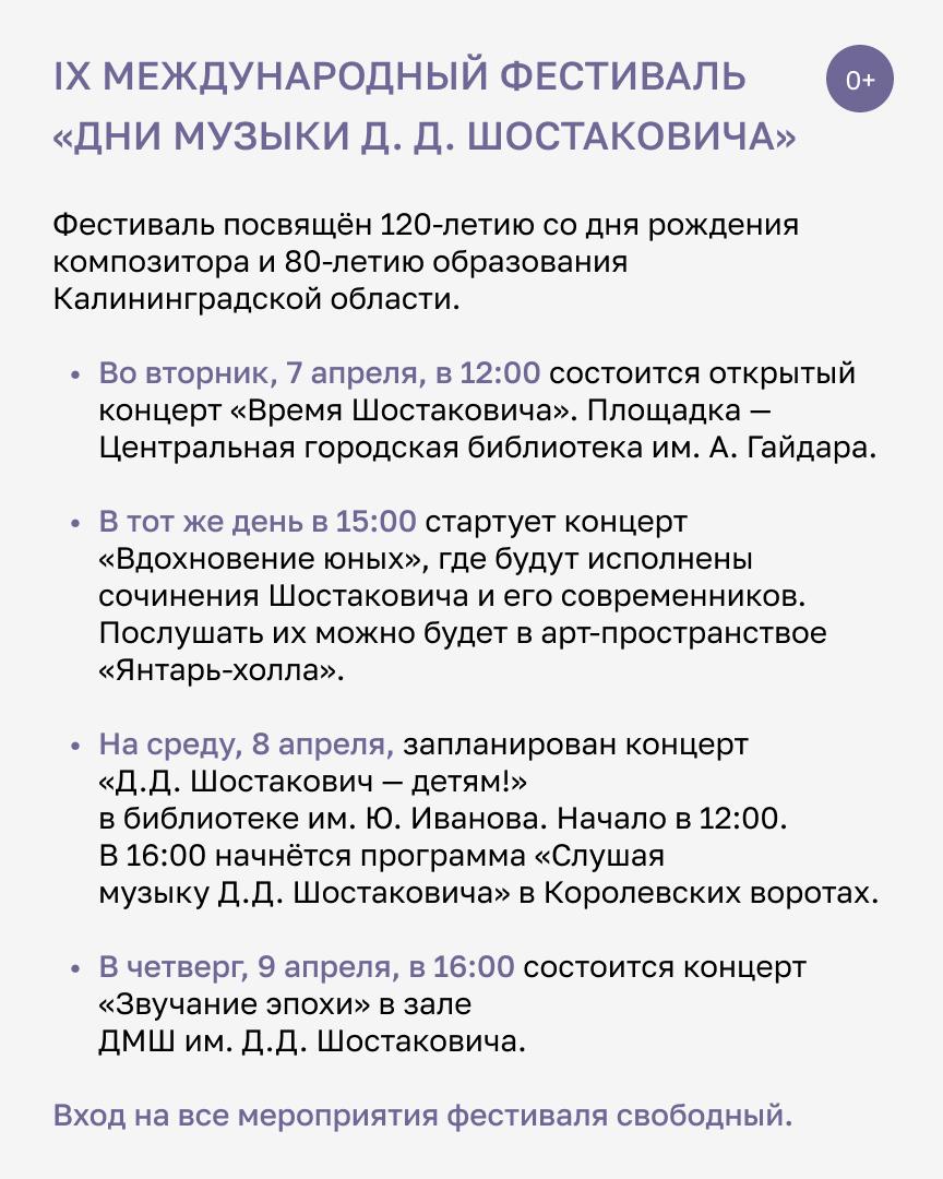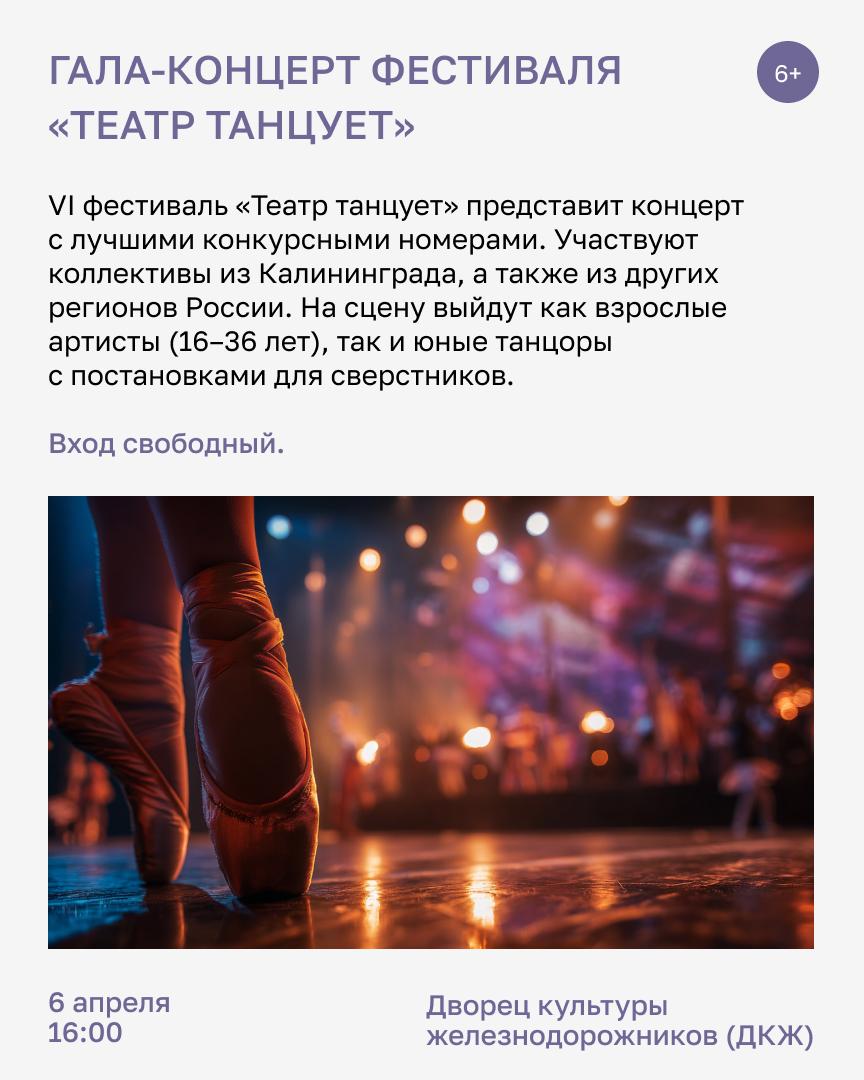 Рабочая неделя в 6 по 10 апреля в Калининграде будет насыщенной. Завершится театральный фестиваль, а музыкальный развернётся во всей красе — и, конечно, не обойдётся без лекций и творческих встреч.