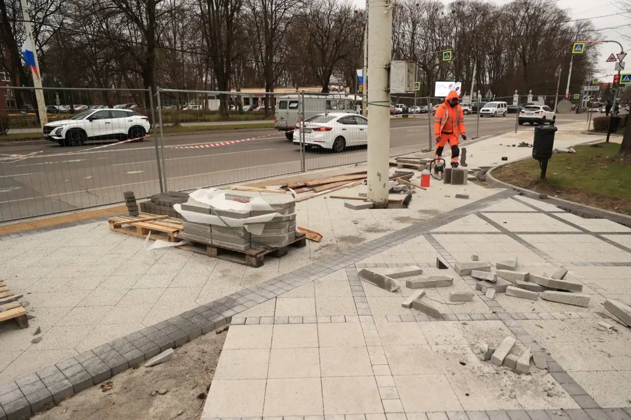 На ул. Краснооктябрьской, где осмотрели отремонтированный тротуар, и на Театральной, где мы обсудили нашу большую «тротуарную программу», рассчитанную на ближайшие годы, а заодно посмотрели процесс обновления остановки общественного транспорта.
