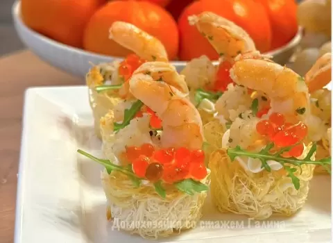 Остывшие корзиночки заполнили творожным сыром. Сверху украсили обжаренными на масле с зеленью креветками и добавили немного икры для изысканности. Листики руколы завершают композицию, привнося легкую горечь, которая гармонично сбалансирует вкус блюда. Результат — хрустящие, нежные и праздничные закуски, способные удивить гостей на любой торжественной встрече. В конечном итоге, новое кулинарное открытие стало удачной импровизацией, которая не только украсила стол, но и освежила знакомые привычные рецепты.
