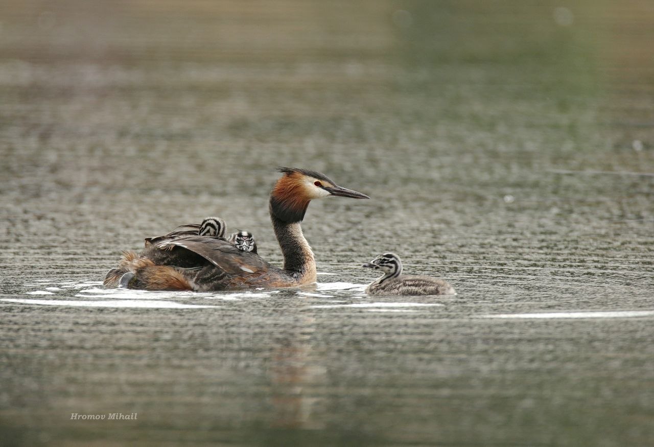 Уже в июне у чомг появятся птенцы. Первые дни малыши обычно проводят прямо на спине у родителя.