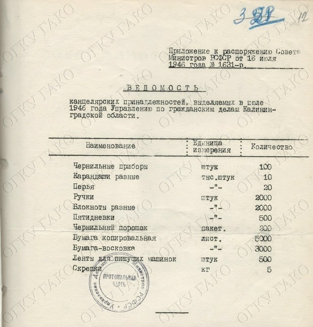 Но начинать пришлось в очень непростых условиях. Об этом говорит документ от 16 июля 1946 года: даже самые обычные канцелярские вещи для областных властей выделяли отдельным распоряжением Совета министров РСФСР. В списке — 100 чернильниц, 500 лент для пишущих машинок и 5 килограммов скрепок.
