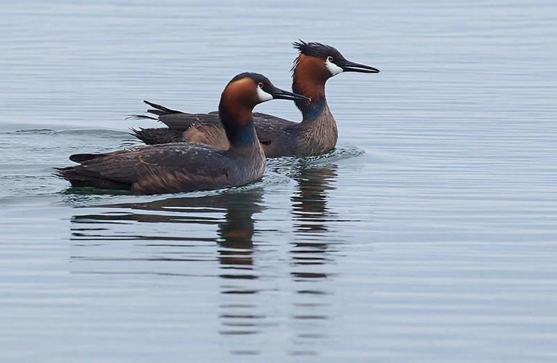 Сейчас у этих экзотических птиц самый интересный период — они красуются друг перед другом своими рыжими бакенбардами и чёрными ушками. Так у представителей этого вида выглядит брачный ритуал. К лету появятся птенцы, которые в июне будут кататься на родительских спинах – это тоже можно увидеть с берега Куршского залива.
