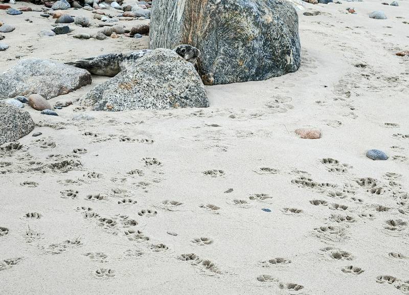Выжившего счастливчика обнаружили неподалёку от посёлка Приморье — малыш лежал за камнем на песчаном пляже. Это щенок примерно месячного возраста, уже перелинявший, но с крошечными «островками» белого детского меха. Волонтёрка рассказала организаторам подсчёта, что сначала она его не заметила. Малыш слился с камнями, но испугавшись вторжения человека рявкнул и пополз к морю. Отпрыск неизвестной тюленихи выглядел активным, без ран, хоть и неупитанным — для линьки это нормально. Весь песок вокруг был отмечен собачьими следами. Видимо, четвероногие бродяги пытались подступиться к тюленю, но тот сумел дать отпор.
