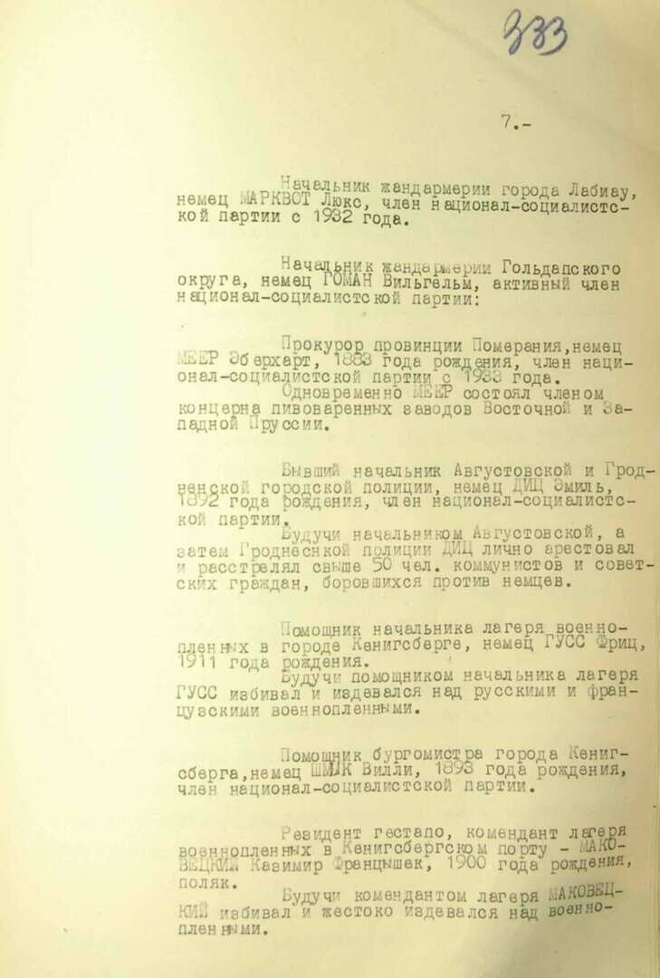 В феврале–апреле 1945 года после штурма «Смерш» и НКВД выяснили обстоятельства расправ, которые нацисты устроили незадолго до капитуляции. Одним из задержанных стал руководитель местной ячейки нацистской партии Отто Машон. На допросе он рассказал, что партийная организация выполняла спецзадания политотдела управления Пруссии и участвовала в расстрелах военнопленных и гражданского населения в лагерях.