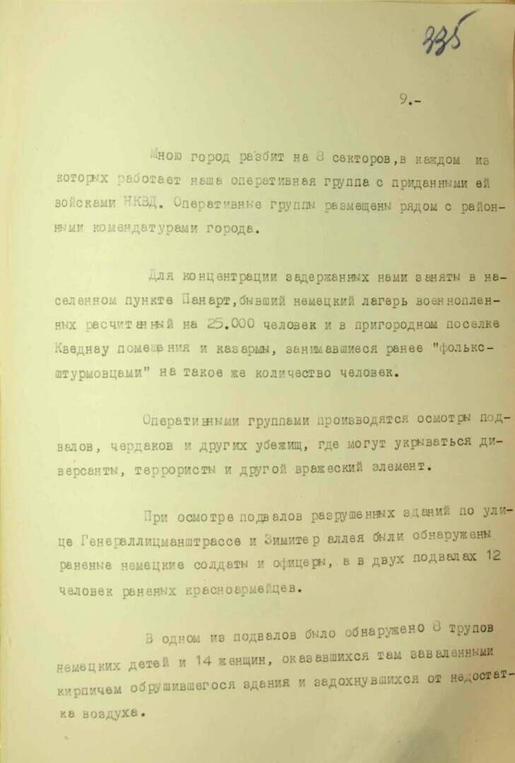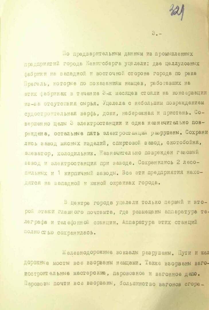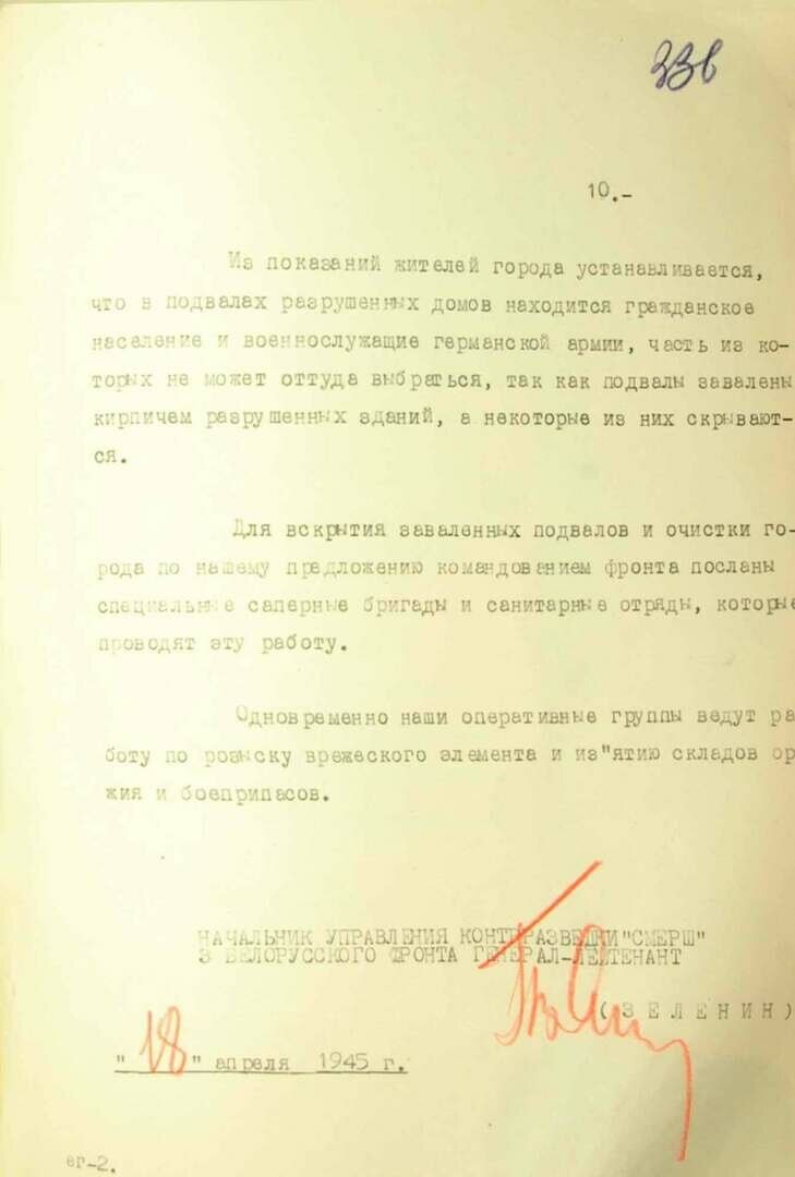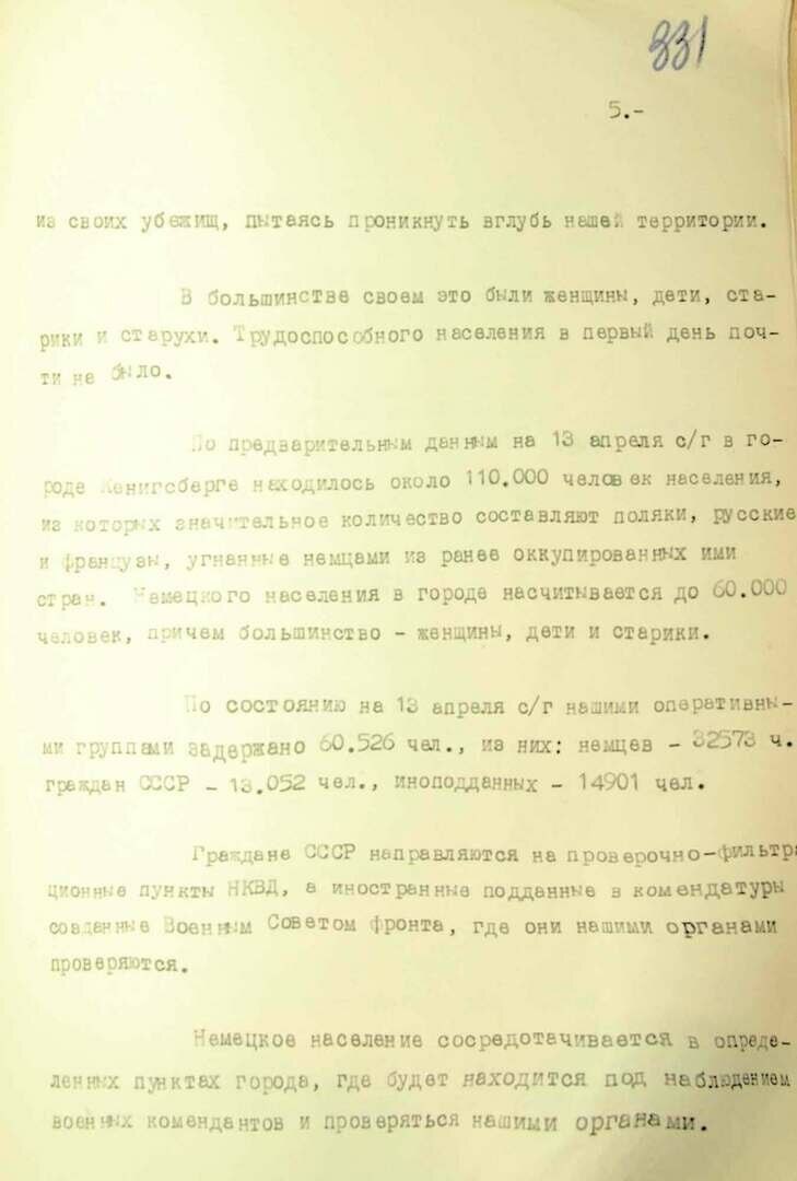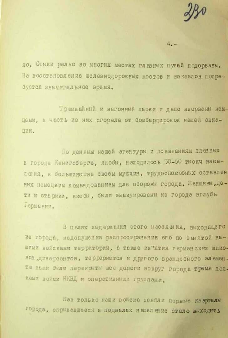 ФСБ также публикует докладную записку начальника управления контрразведки «Смерш» 3-го Белорусского фронта Павла Зеленина, где говорится, что после штурма Кёнигсберг превратился в развалины, а немецкое командование не сдавало город до последнего.
