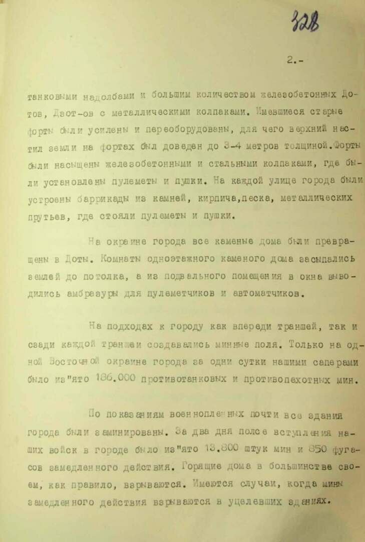 На подходах к городу как впереди траншей, так и сзади каждой траншеи создавались минные поля. Только на одной восточной окраине города за одни сутки нашими сапёрами изъято 186 тысяч противотанковых и противопехотных мин. <...> Почти все здания города были заминированы. За два дня после вступления наших войск в городе было изъято 13 800 штук мин и 850 фугасов замедленного действия», — говорится в документах.