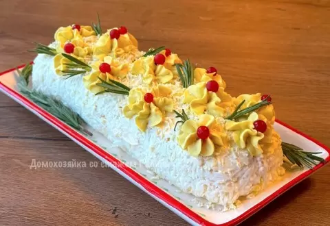 Так, для создания рулета слои укладываются на пленку: сначала белки с майонезом, затем тертый сыр, морковь, рыба, нарезанный лук, да еще немного майонеза — и так по кругу. В самом конце добавляется тертое сливочное масло и картофель. Заворачивая рулет, его можно поставить в холодильник для пропитки, а затем украсить оставшимися желтками и оригинальным кремом, придающим свежий акцент вкусному блюду.