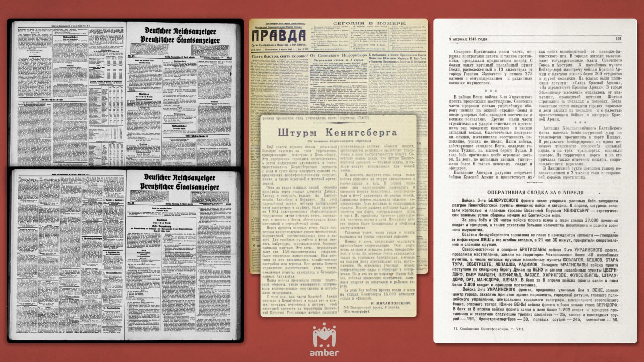 Но, по словам историков и современников, немцы не забывали писать, что держат оборону и проводят контратаки — но эти развороты есть только в частных коллекциях, в открытом доступе их не найти. О том, что Красная армия взяла Кёнигсберг, не было ни слова. Интересно — почему?