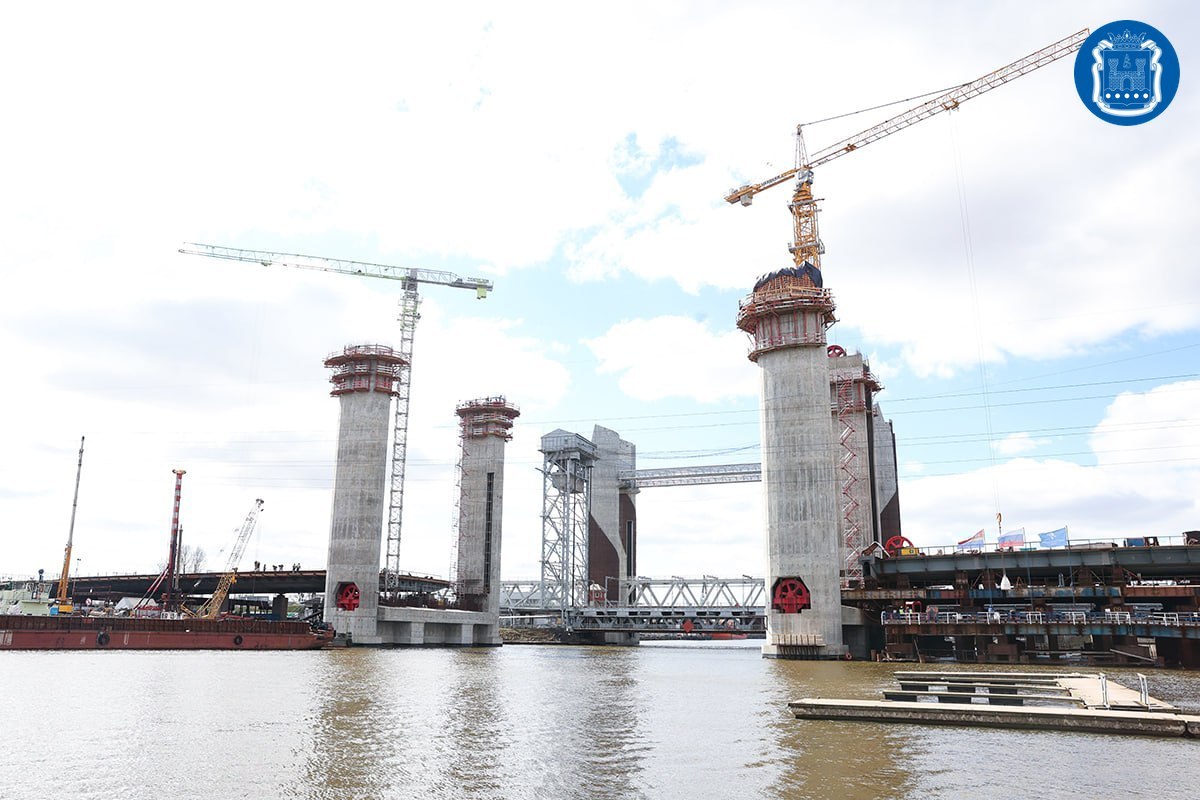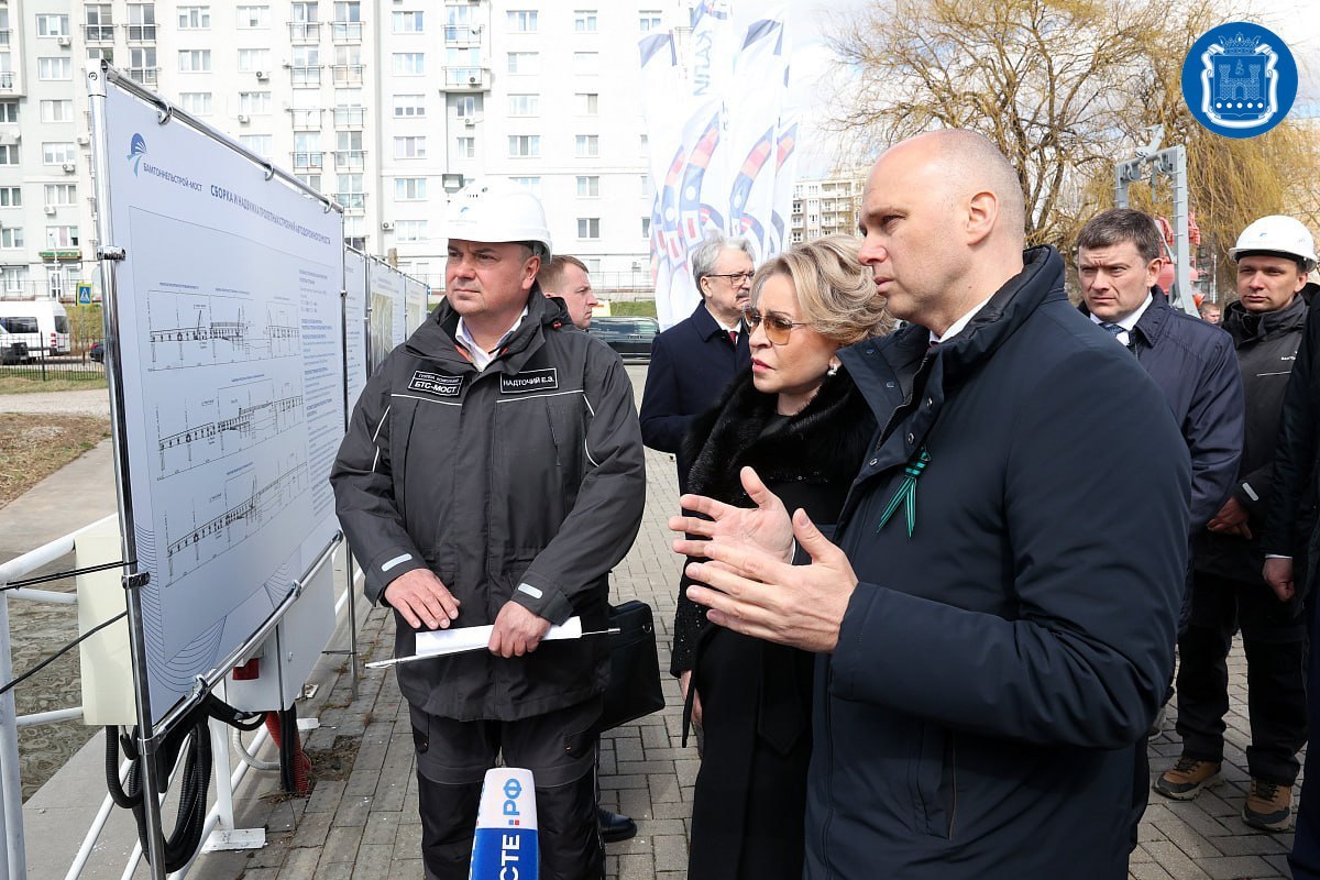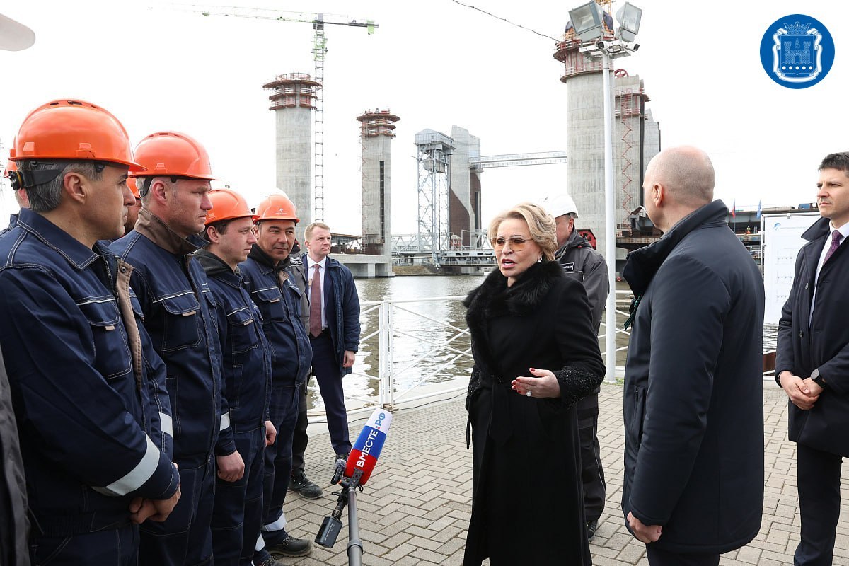 На строительстве автодорожного моста через Преголю Валентина Матвиенко пообщалась с рабочими, поблагодарила их за добросовестный труд.
