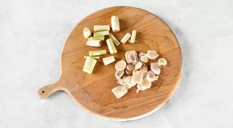 Начните с подготовки ключевых ингредиентов: возьмите стебли лемонграсса и удалите их сухие верхушки. Мясистую часть слегка раздавите, затем нарежьте на кусочки длиной 2–3 см. Галангал, напоминающий имбирь, нарежьте тонкими ломтиками.