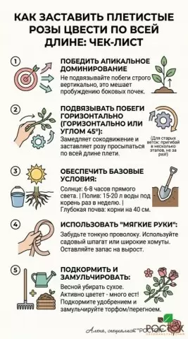 Плетистые розы — настоящие украшения любого сада, и чтобы они радовали глаз, важно правильно их «настроить». При должном уходе они могут цвести не только на верхушках, но и по всей длине ветвей.