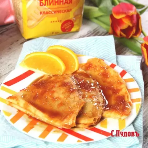 Речь идет о классических блинах «Креп Сюзетт», который стал символом французской кулинарии. История гласит, что этот рецепт появился в Монте-Карло в 1895 году, когда кулинар удивил принца Уэльского, будущего короля Англии Эдуарда VII. Блины с апельсиновым соусом произвели на него такое впечатление, что он щедро наградил повара драгоценным кольцом.