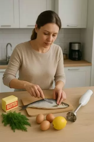 Первым делом филе сельди очищается от кожи и костей, а затем нарезается на небольшие кусочки. В блендере филе перемалывается до пастообразной консистенции. Добавьте варёное яйцо, лимонный сок и горчицу. Всё тщательно перемешайте.