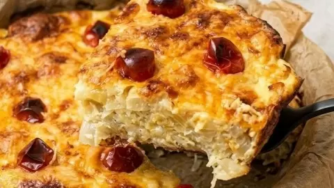 Важно отметить, что половину сыра лучше добавить в заливку, а другую оставить для посыпки верха пирога.
