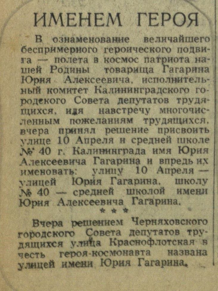 Днём позже, решением горсовета, именем Юрия Алексеевича Гагарина переименуют одну из улиц (она и сегодня на своём месте), оперативный “ребрендинг” затронет и школу №40 (она и по прежнему им. Гагарина).