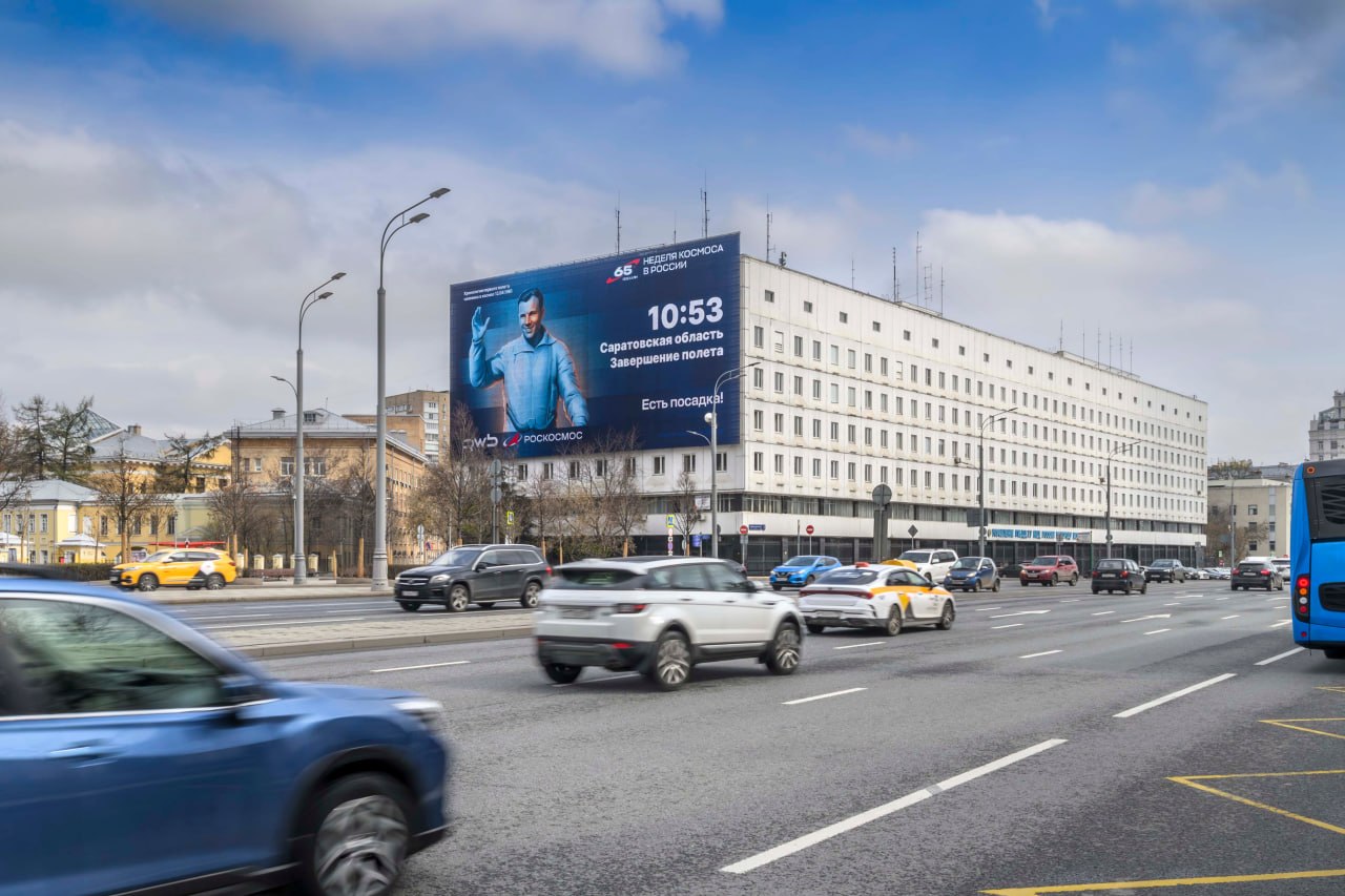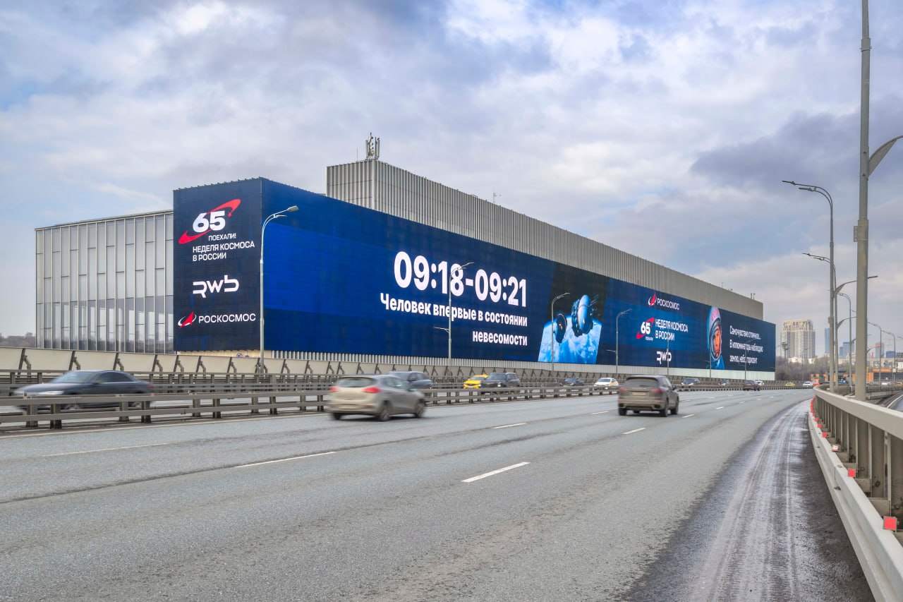 Russ задействовал новые технологии в трансляции хроники в виде синхронных показов единого креатива и последовательно появляющихся фраз Юрия Гагарина на расположенных рядом экранах.