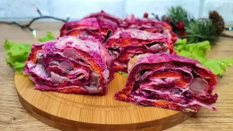 Эта закуска, несомненно, привлечёт внимание всех присутствующих. Она складывается из простых, однако, гармоничных ингредиентов: тонкого лаваша, сочной свёклы, нежной моркови и слабосолёной сельди. Сочетание сладковатой свёклы с насыщенной морковью и солёной рыбой создаёт неповторимый и запоминающийся вкус, который станет ярким акцентом на праздничном столе.