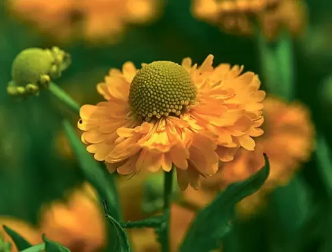 - Цветение: гелениумы могут похвастаться оранжевыми, желтыми и красными соцветиями с эффектными коричневыми или желтыми центрами. Цветы появляются с июня до сентября.