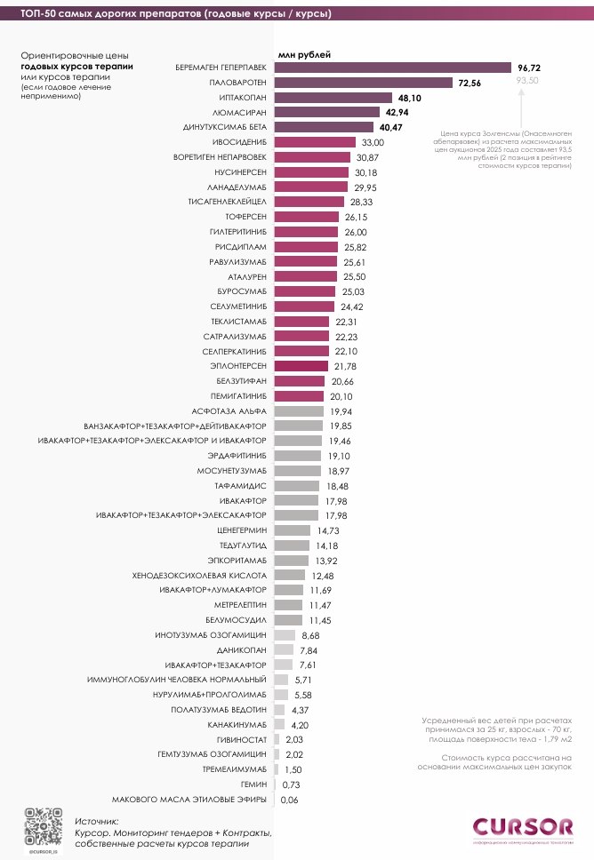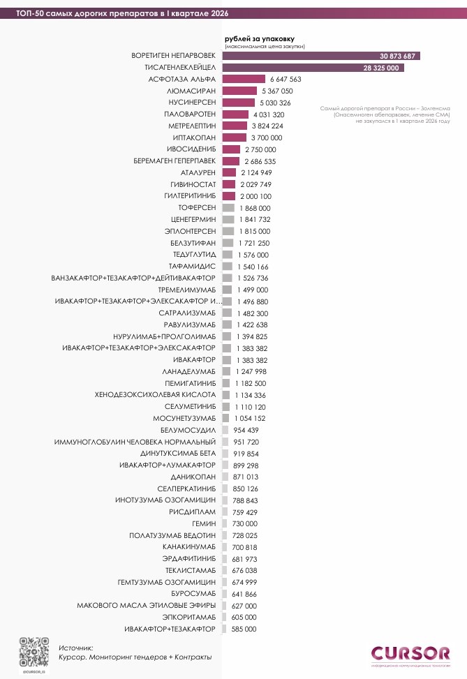 Средняя цена упаковки по 50 самым дорогим препаратам за три месяца 2026 года достигла 1,39 млн рублей, а курса терапии — 19,7 млн рублей, средневзвешенная стоимость курса – 20,8 млн рублей.