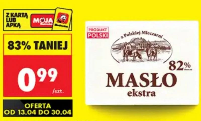 Сливочное масло 82% жирности в течение 2 недель будут предлагать по акционной цене 0,99 злотых (22,18 рубля) за упаковку 200 граммов, что соответствует 110,9 рублей за килограмм