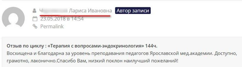 А вот на сайте Врачебной палаты Калининградской области 8 лет назад кто-то из-под аккаунта Ларисы Ивановны Ч. поблагодарил педагогов Ярославской медицинской академии за 144-часовой курс терапии с вопросами – эндокринология.