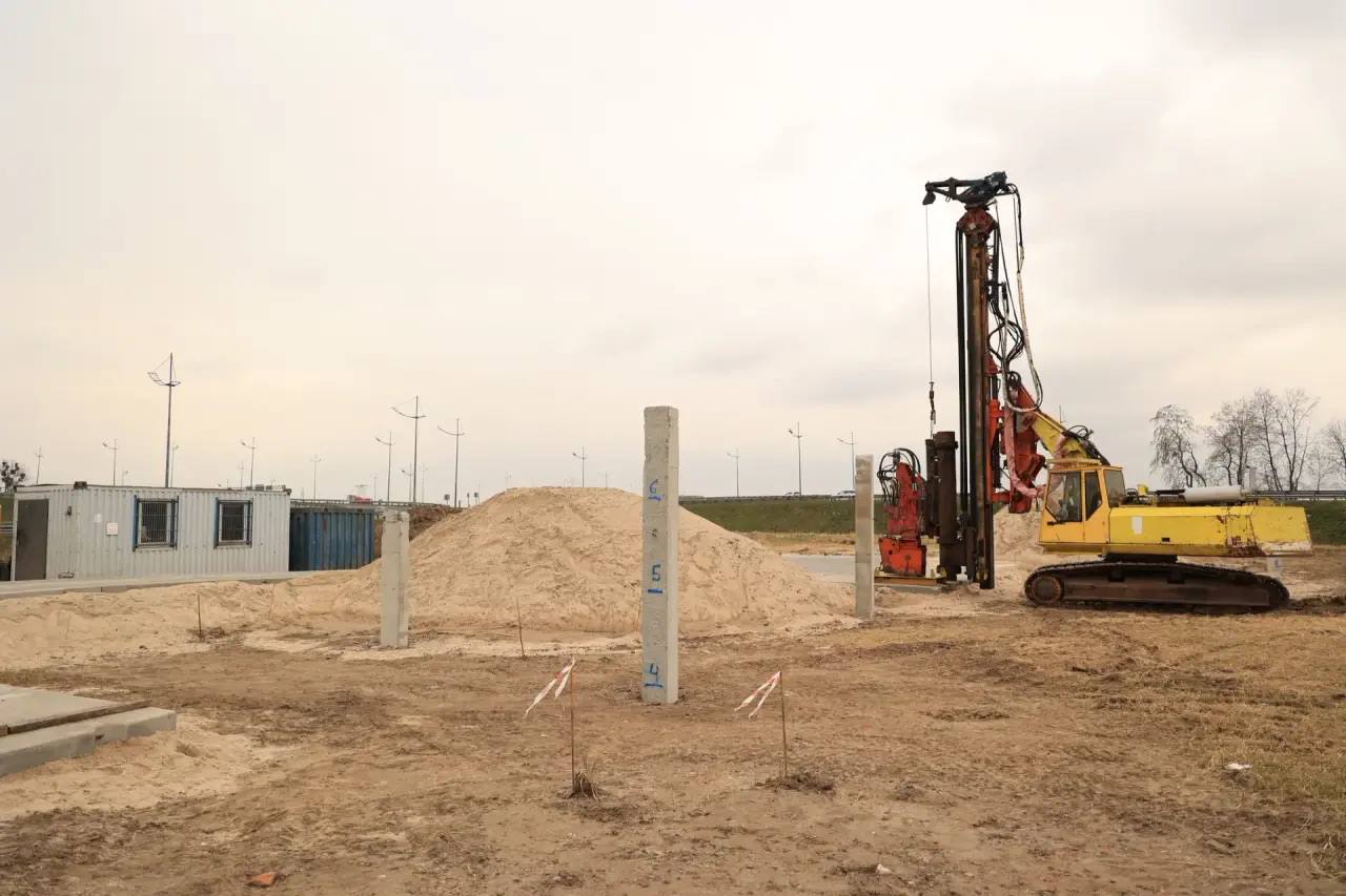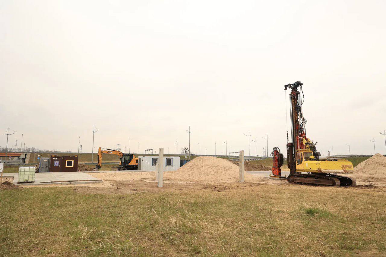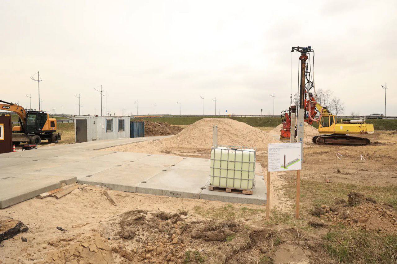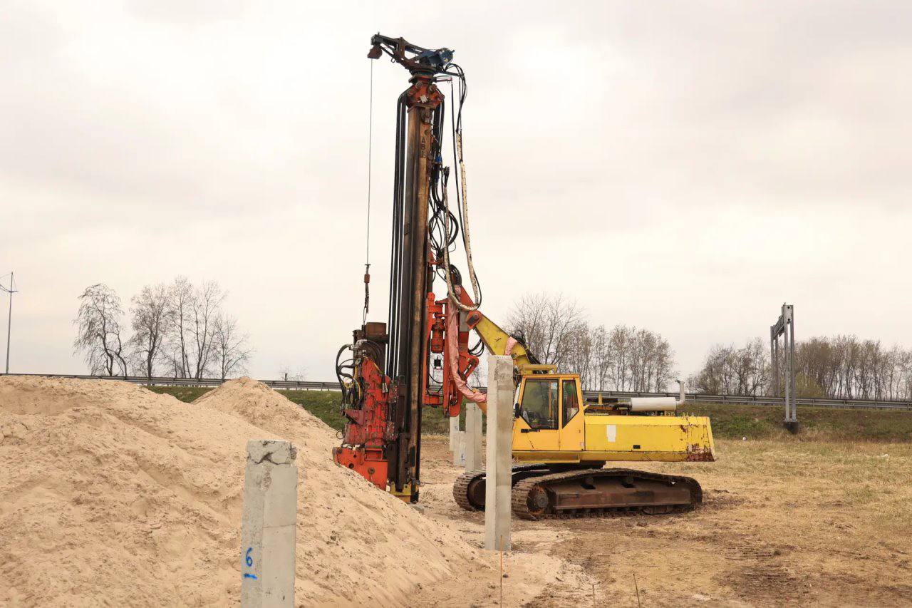 Начали работы по монтажу въездного знака на въезде в город со стороны улицы Невского. Подрядчик подготовил съезд, завершает установку свай, приступает к заливке фундаментной плиты.