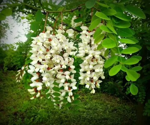 - Белая акация — также известная как робиния, славится своей красотой. В июне она радует глаз белоснежными цветками и лучше растет в южных регионах.