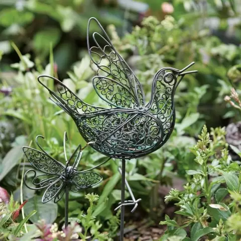 Обратите внимание на лапы и опоры. Чтобы фигура была устойчивой, используйте проволоку потолще для лап и широко расставляйте их. Можно добавить дополнительную опору, к примеру, «посадив» птицу на ветку или металлический штырь. Для насекомых создавайте декоративные подставки в виде стеблей или камней.