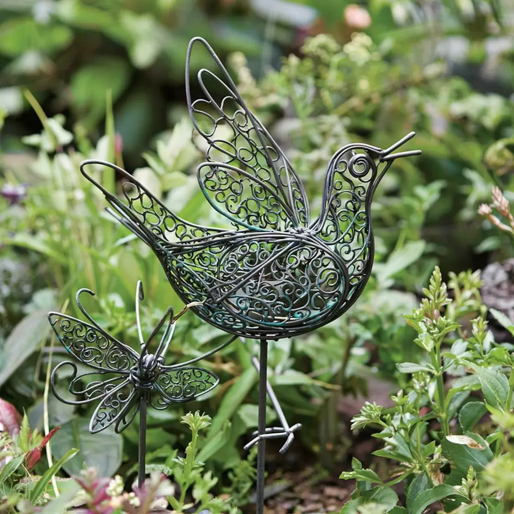 Размещение скульптур в саду — это также искусство. Они должны находиться в неожиданных местах, чтобы создавать сюрпризы. Например, бабочка может «поселиться» на краю каменной клумбы, а ажурный аист — среди декоративной травы у прудика. Такие находки несомненно порадуют ваших гостей и добавят вашему саду очарования.
