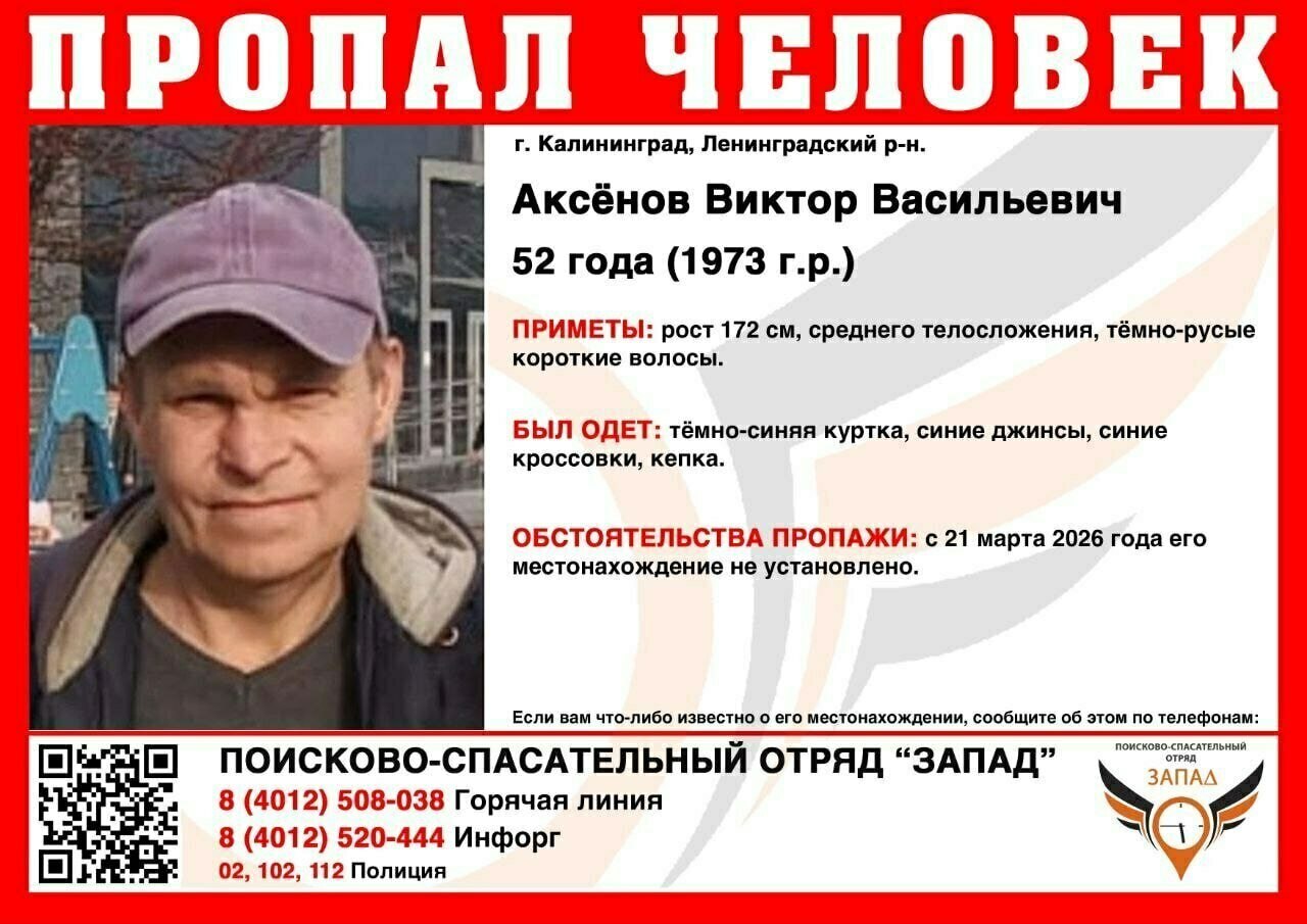 Виктор Аксёнов не выходит на связь с 21 марта. Его местонахождение не установлено. Рост пропавшего — 172 см, он среднего телосложения, с короткими тёмно-русыми волосами. Был одет в тёмно-синюю куртку, синие джинсы, такого же цвета кроссовки и кепку.