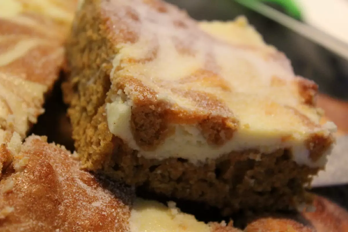 Легкими движениями ножа аккуратно смешайте верхний слой теста и крем, чтобы получить художественный рисунок. Выпекайте пирожные в разогретой духовке 30-40 минут, проверяя готовность с помощью шпажки. Дайте полностью остыть, а затем нарежьте на порционные кусочки. Эти ароматные пирожные идеально подойдут для семейного чаепития или угощения друзей.