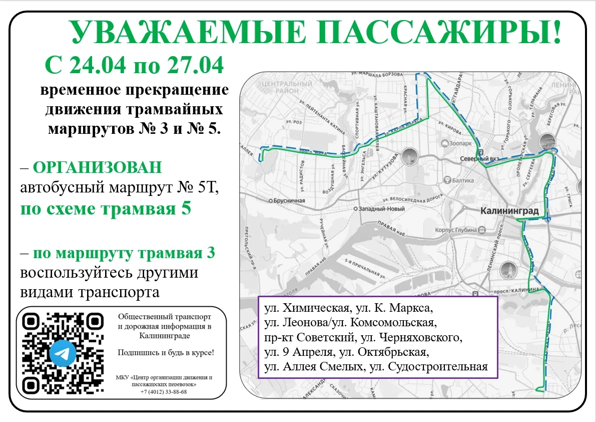 Информацию о временной отмене трамвайного движения со схемой маршрута №5Т разместим на трамвайных остановках.