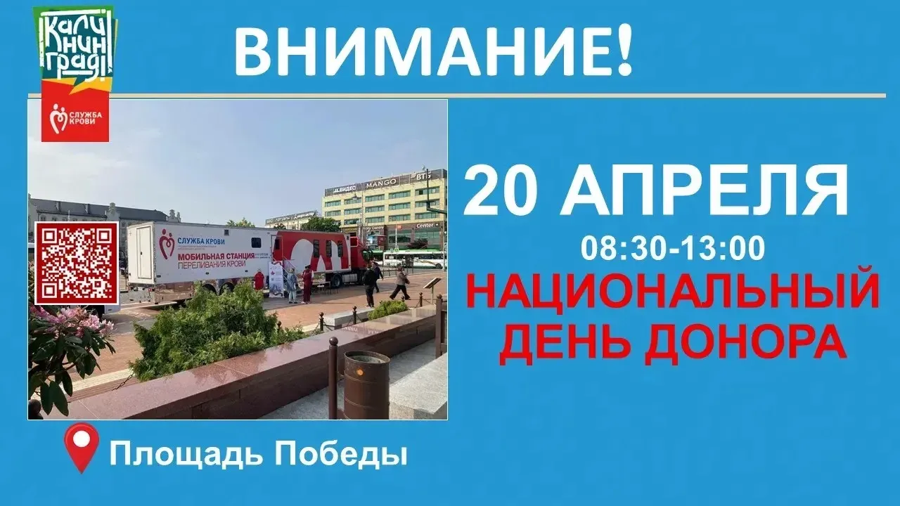 20 апреля на площади Победы пройдет масштабная акция, приуроченная к Национальному дню донора крови. В самом сердце города будет работать мобильный комплекс Станции переливания крови Калининградской области.