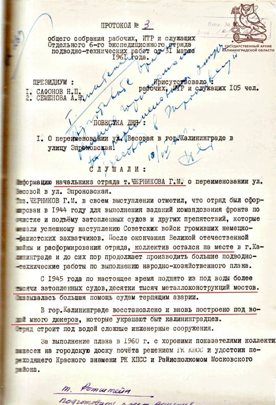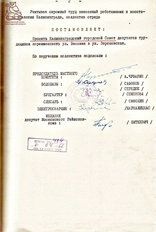 Именно поэтому улицу, где находилось их рабочее здание, решили переименовать в Эпроновскую. Так в названии городской улицы сохранилась память о людях, которые буквально поднимали послевоенный Калининград со дна.