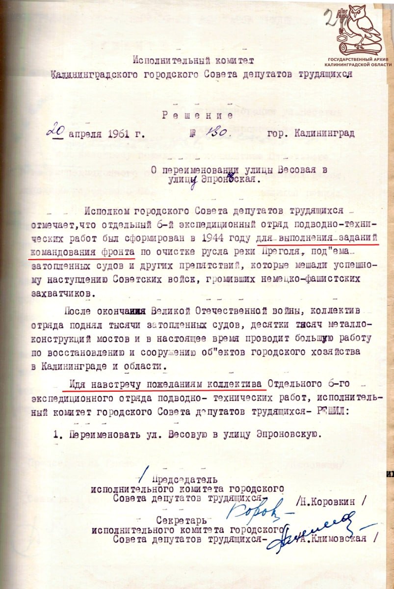 20 апреля 1961 года в Калининграде улицу Весовую переименовали в Эпроновскую