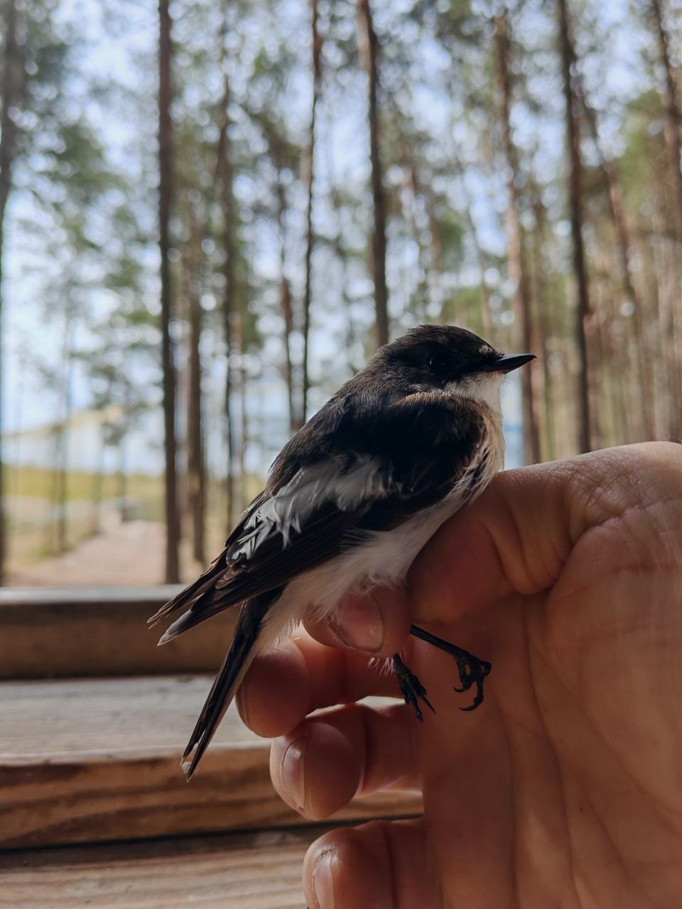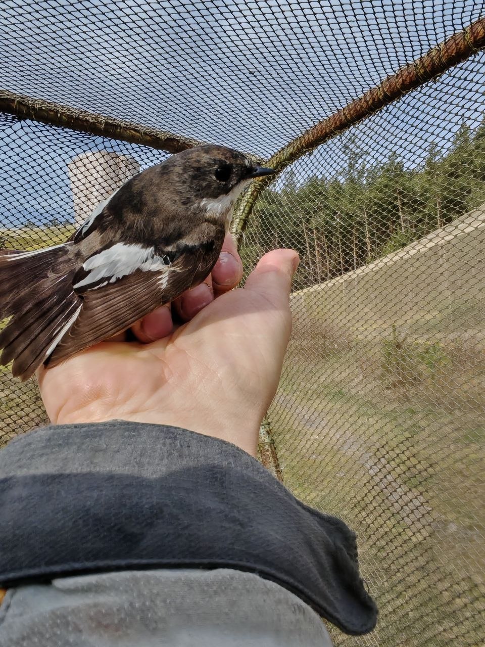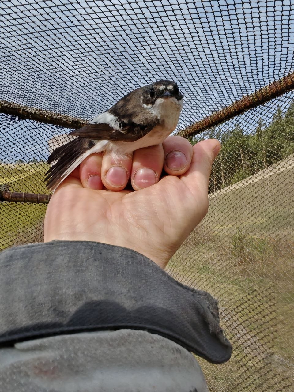 Это взрослый самец мухоловки (Ficedula hypoleuca). Последние несколько дней идёт активный пролет птиц и в сети попадаются и зяблики, чижи и вьюрки.
