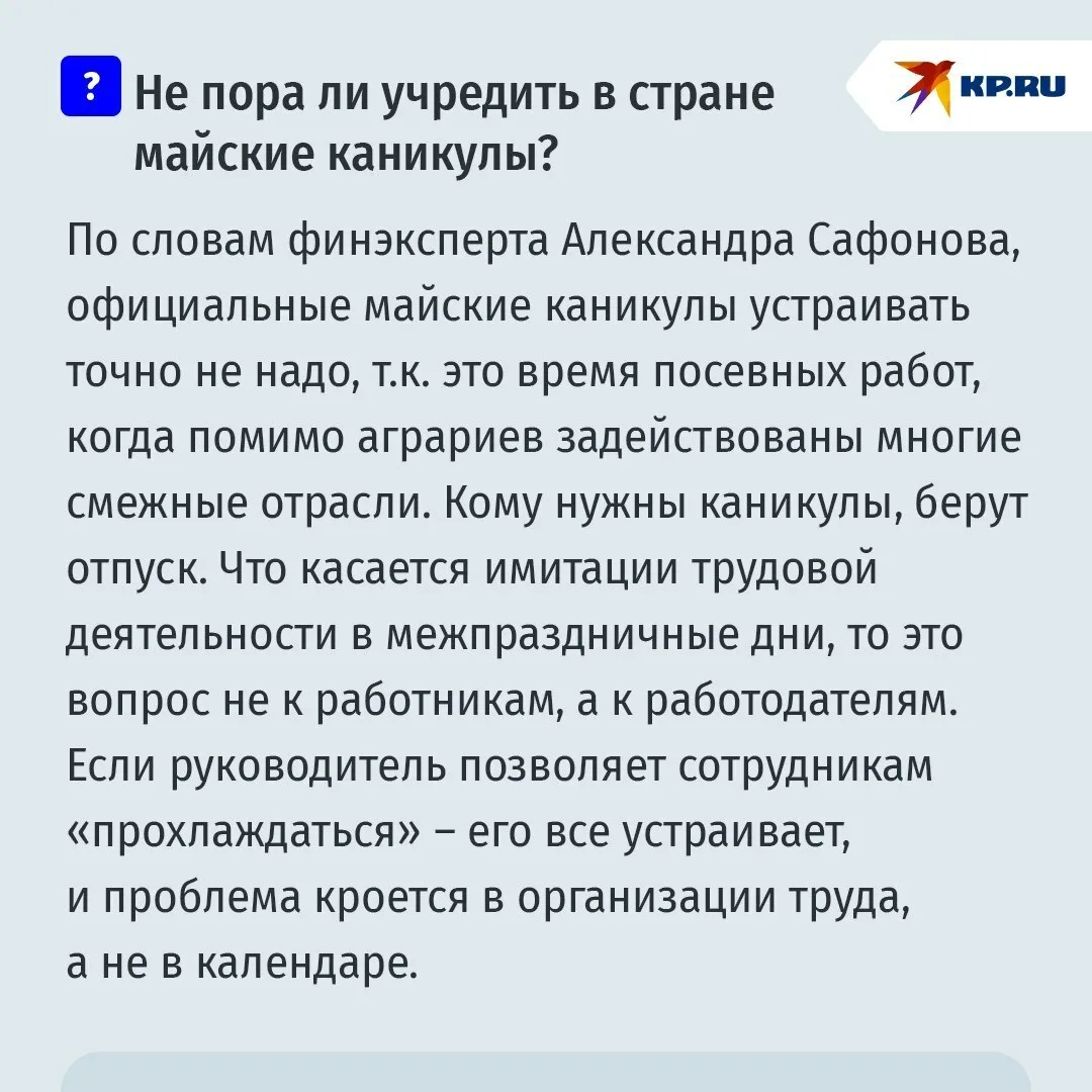 Ещё часть людей вообще берёт отпуск или отгулы, чтобы продлить отдых. Напомним, в этом году длинные выходные — с 1 по 3 мая и с 9 по 11 мая.