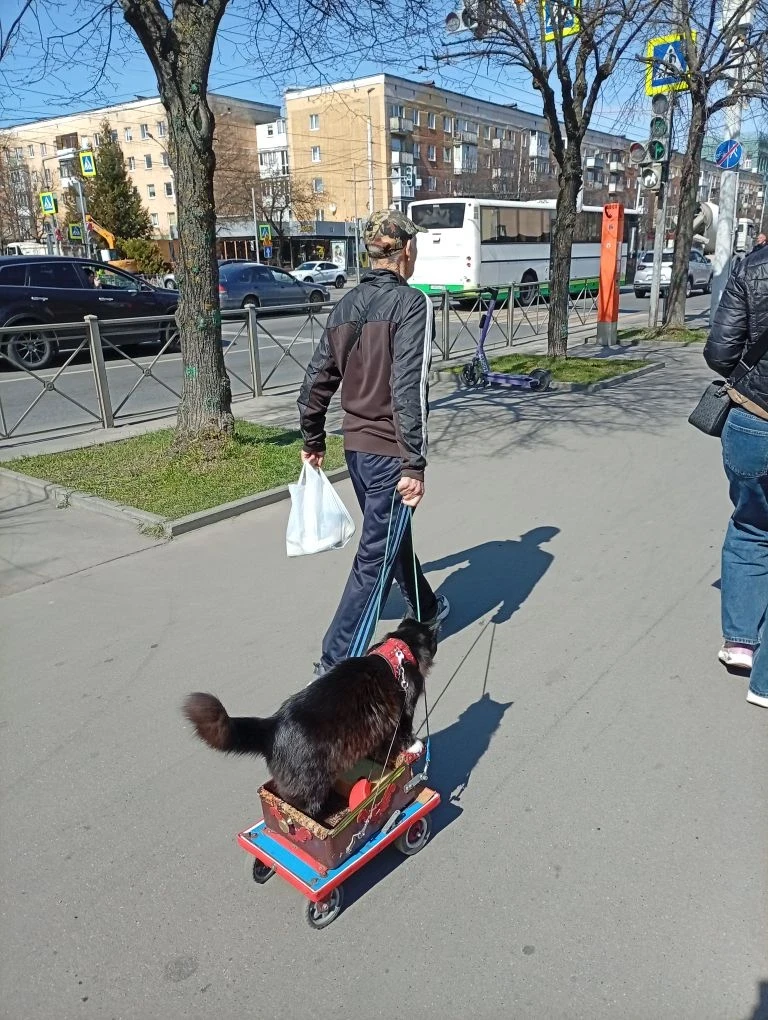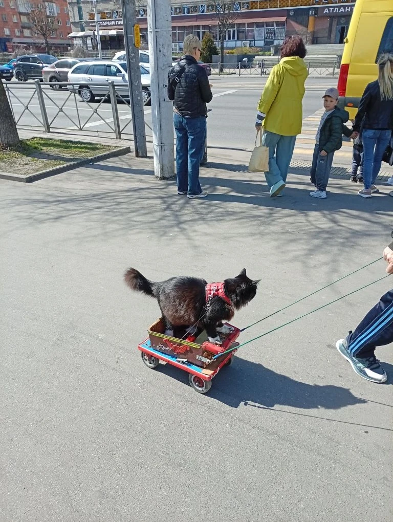 На Ленинском проспекте заметили заботливого хозяина, который выгуливает кошку с максимальным комфортом.